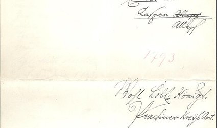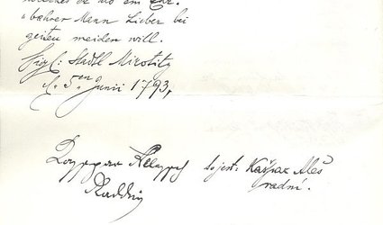 Text napodobující dokument z 19. století. Datováno 5. Juni 1793. Podepsán Kašpar Aleš. Psáno po dvou stranách černým perem na archu papíru. Na první straně poznámka Herrmanna červenou pastelkou: Aleš.