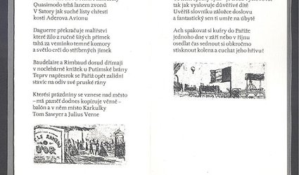 Praha, Spolek českých bibliofilů, 1977. OBr., volně vložené archy, nestr. (11 s.). Tři lepty Kamil Lhoták. Redakce Karel Cvejn a František Dvořák. Grafická úprava Josef Týfa. Tisk k 65. narozeninám Kamila Lhotáka. V tiráži podpis výtvarníka a spisovatele. Neudaný počet výtisků na ručním velkolosínském papíře.