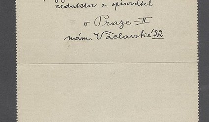 Šedivá zálepka, razítko, prošlé poštou. Adresát: Velevážený Pan p. Ignát Herrmann redaktor a spisovatel v Praze - II, nám. Václavské 32. Datováno V Nuslích - II, 19 března 914. Datumka přijetí Herrmannem: 20. břez. 1914. Rytíř mluvil s Topičem a žádal zálohu. Topič mu sdělil, že jedině Herrmann je oprávněn dávati zálohu, a proto ho Rytíř prosí o přijetí. Přikládá jedno hollandské a belgické ex libris. Na zálepce razítko Václava Rytíře.