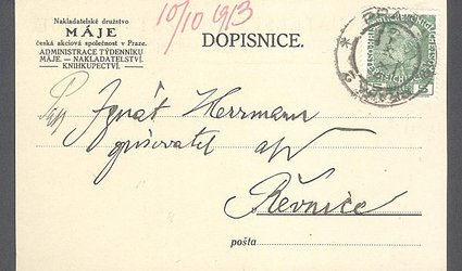 Adresát: Pan Ignát Herrmann spisovatel an Řevnice. Známka, razítko, prošlé poštou. Dopisnice s hlavičkou Nakladatelského družstva Máje. Bez údajů. Dle razítka odesláno z Prahy X.X. Nad adresou napsán datum červeným perem, přijetí dopisnice Herrmannem: 10/10 1913. Psáno po jedné straně černým perem. Herites informuje Herrmanna, že podobizna Nerudy byla v Máji zveřejněna v roce 1878, jak se dozvěděl od Boreckého. Dopis mu pošle ke korektuře i s poznámkou.