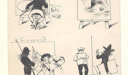 Originální kresba černým perem 13,8 x 11,8 cm. Nesignováno, nedatováno. Dobová pasparta. Vzadu poznámka Ignáta Herrmanna tužkou: Viktor Oliva 1886. Kresba pro časopis Švanda dudák.