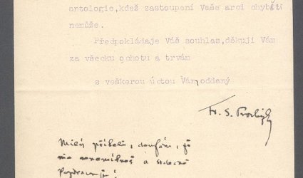 Datováno V Praze dne 11. dubna 1918. Psáno na dopisním papíře s hlavičkou nakladatelství Jos. R. Vilímek v Praze, dvě strany na stroji a černým perem. Na první straně Herrmannova datumka: 18.IV. 1918. Procházka připravuje pokračování "Vybraných českých humoresek" (první vydání v roce 1894). Žádá Herrmanna o svolení, aby zde mohl opětovně uveřejnil jeho starou práci. Samozřejmě za honorář. Nové vydání by mělo být jinak uspořádáno a doplněno tak, aby byl podán úplný obraz vývoje české humoresky a satiry od počátků v 19. století až po dnešek. Zároveň by kniha měla obsahovat biografii autorů. Proto zde Herrmann nemůže chybět. Herrmann si na dopis tužkou poznamenal, že mu odpověděl 19/4, se vším je srozuměn a navrhuje, aby v knize byla uveřejněna humoreska novější i satira. Vyžaduje ale vrácení autorského rukopisu.
