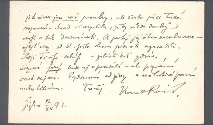 Kartička s logem Ústřední matice školské. Datováno Žižkov12/XII 93. Psáno po dvou stranách černým perem. Rais děkuje za podobiznu matky, kterou mu Herrmann poslal. Reaguje ma jeho poslední dopis, který ho mile překvapil. Posílá pozdrav manželce a těší na setkání v pondělí.