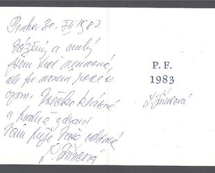 Novoroční přání. Na první straně barevný linoryt, Chrpová panenka, 6,1 x 4,7 cm. Signováno uprostřed tužkou. Na druhé straně věnování Ludmily Jiřincové modrým perem, na třetí straně podpis výtvarnice.