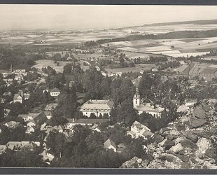Černobílá pohlednice Potštejna. Vzadu podpis Marie Pujmanové černým perem. Bez údajů.