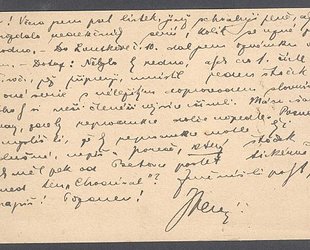 Adresátka: Váž. Paní Maryna Malá, choť akad. malíře, Vršovice, Hálkova 457. Razítko, prošlé poštou. Dle razítka datováno Bavorov, 1918. Psáno po dvou stranách černým perem. Veselý píše, že marně upomíná nakladatele Batovce o grafické otisky. Žádá radu, který ze štočků otisknout v časopise Loutkář.