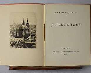Praha, Klub zaměstnanců Léčebného fondu veřejných zaměstnanců, 1940. Grafické zjevy svazek 1. OBr., 17 (1) s. 6 čb. obrazových příloh. Ve frontispisu lept J.C. Vondruše "Sv. Mikuláš z Hradčan", signováno vpravo dole tužkou. Kniha obsahuje seznam grafických prací J.C. Vondruše. Celkem 300 číslovaných výtisků, tento výtisk č. 172. V tiráži slepotiskové razítko a věnování předsedy Knihovní rady.