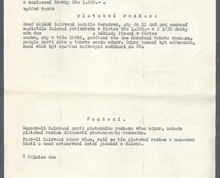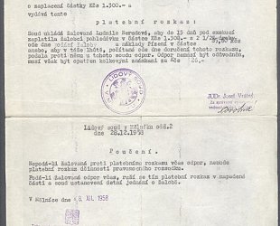 1. Dopis právního zástupce Jana Zrzavého paní Ludmile Nerudové z Neratovic. Datováno v Praze dne 5. září 1958. Právník Dalibor Plachta vyzývá adresátku, aby zaplatila malíři dluh ve výši 1300,- Kč, jinak na ní bude podána žaloba. Nerudová si od malíře půjčila 1800,- Kč s tím, že bude splácet 200,- Kč měsíčně. Dluh měl být uhrazen do března 1957. Dosud však Nerudová uhradila pouze 500,- Kč. Psáno na papíře A4 po jedné straně na stroji. 2. Platební rozkaz vydaný Lidovým soudem v Mělníce na základě žaloby Jana Zrzavého. Datováno V Mělníce dne 8.XII. 1958. Soud ukládá Nerudové, aby do 15-ti dnů uhradila malíři 1300,- Kč s úroky a soudní poplatky, jinak na ni bude uvalena exekuce. Pokud adresátka podá proti rozkazu odpor, musí jej opatřit příslušnými kolky. Psáno po jedné straně na stroji na papíře A4. Razítka. 3. Tentýž platební rozkaz bez vyplněných údajů. Celkem tři kusy.