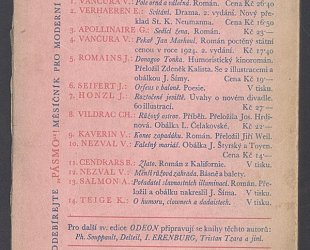 Praha, Jan Fromek, 1925. Odeon svazek 8. OBr., 130 (1) s. Překlad Jos. Hrdinová. Obálka, orig. litografie L. Čelakovská. Kromě běžného vydání vyšlo 25 číslovaných výtisků na pap. Japan Banzay podepsaných autorem. Tento výtisk nečíslován.