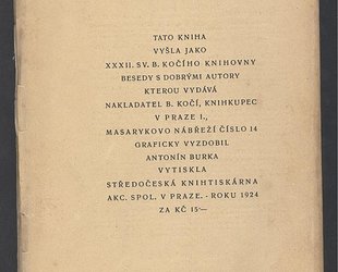 Praha, B. Kočí, 1924. Besedy s dobrými autory svazek 32. OBr., 160 s. Grafická úprava a obálka Antonín Burka.