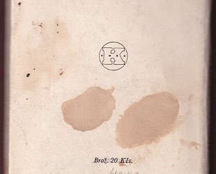 Druhá strana obálky ušpiněna, skvrny od vody.