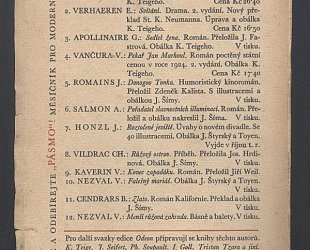 Praha, Jan Fromek, 1925. Odeon svazek 1. OBr., 212 s. Obálka Karel Teige. Kromě běžného vydání vyšlo 60 číslovaných a 40 nečíslovaných výtisků na pap. Japan Banzay. Tento výtisk nečíslován.
