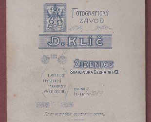 Kabinetní fotografie 16,4 x 10,6 cm. Fotografoval Fotografický závod D. Klíč, Třída Svatopluka Čecha č. 63, Židenice. Rok 1909. Číslo plotny 7239.