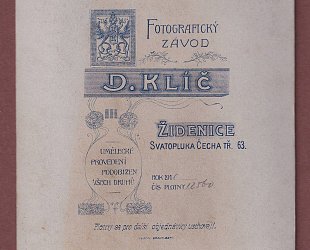Kabinetní fotografie 16,3 x 11 cm. Fotografoval Fotografický závod D. Klíč, Třída Svatopluka Čecha č. 63, Židenice. Rok 1910. Číslo plotny 12560.