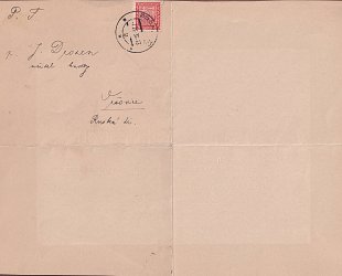 Parte houslaře Břetislava Příhonského. Zemřel v neděli 5. dubna 1931. Zpopelněn byl ve čtvrtek 9. dubna 1931. Datováno Praha v dubnu 1931. Vzadu adresát černým perem: P. T. p. J. Drozen, učitel hudby, Vršovice, Ruská tř. Známka, razítko, prošlé poštou.