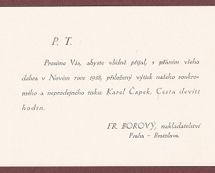 Praha - Bratislava, František Borový, 1937. OBr., 29 (6) s. Ilustrace a grafická úprava Eduard Milén. Neprodejný, soukromý tisk nakladatelství k Vánocům 1937. Vložen dopis Františka Borového pro nakladatele A. Šmahela. Datováno Praha, dne 29. 12. 1937. Psáno na hlavičkovém papíře nakladatelství, jedna strana na stroji, podpis razítkem. Borový děkuje za spolupráci. Zasílá dva tisky, Hovory s TGM a Cestu devíti hodin, jako přání k Novému roku 1938. Vložena také kartička s tištěným textem, přání Františka Borovského k Novému roku 1938.