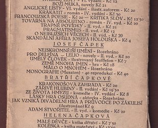 Praha, Otakar Štorch-Marien, 1928. Aventinum svazek 91. OBr., 106 (3) s. Obálka a typografická úprava Josef Čapek. Ilustrace Karel Čapek.