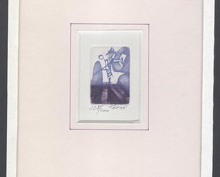 Barevný lept 4,8 x 3,3 cm. Signováno vpravo dole tužkou. List č. 128/200. Pasparta, sklo, lepený rám. Tisk Lyry Pragensis.